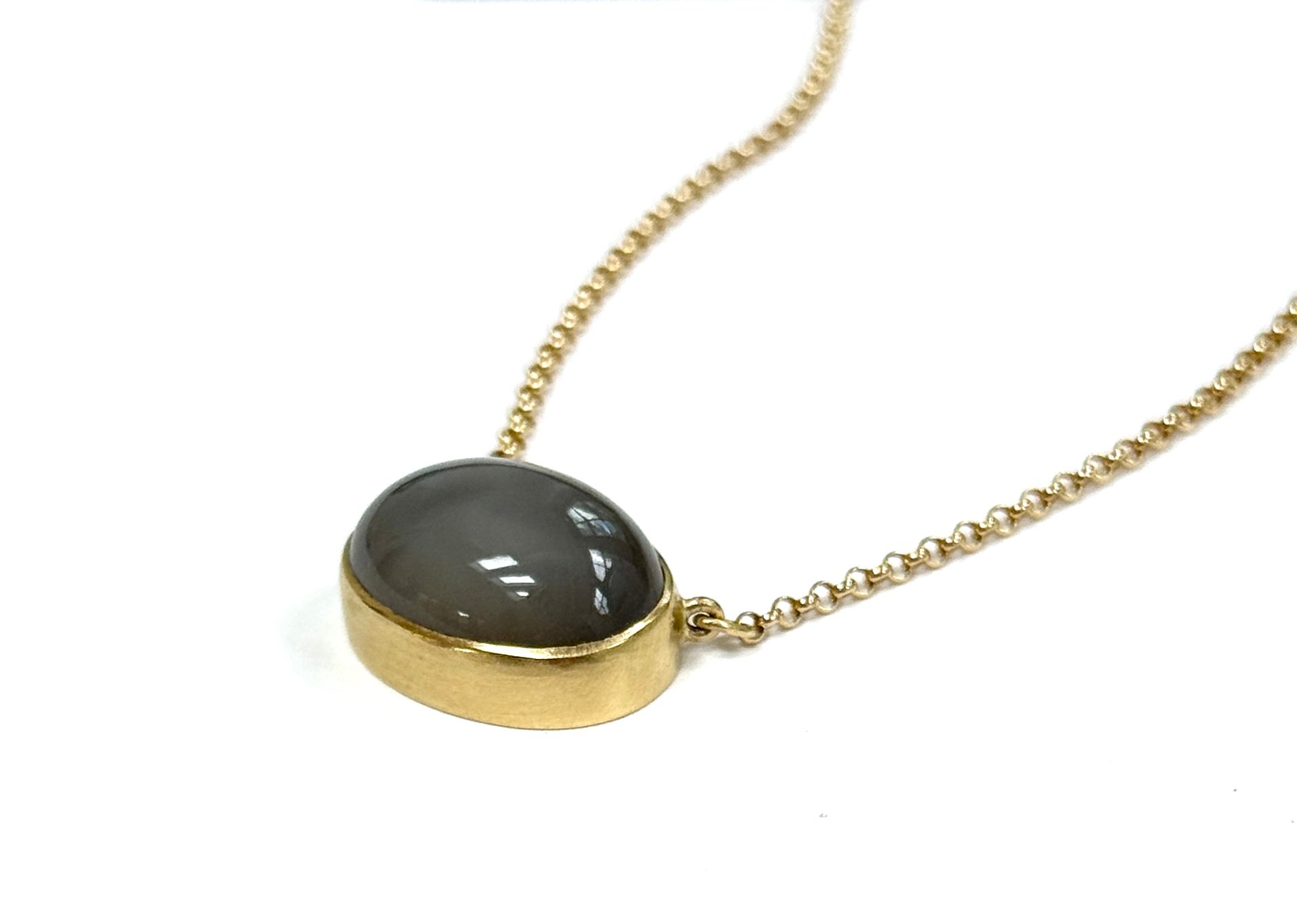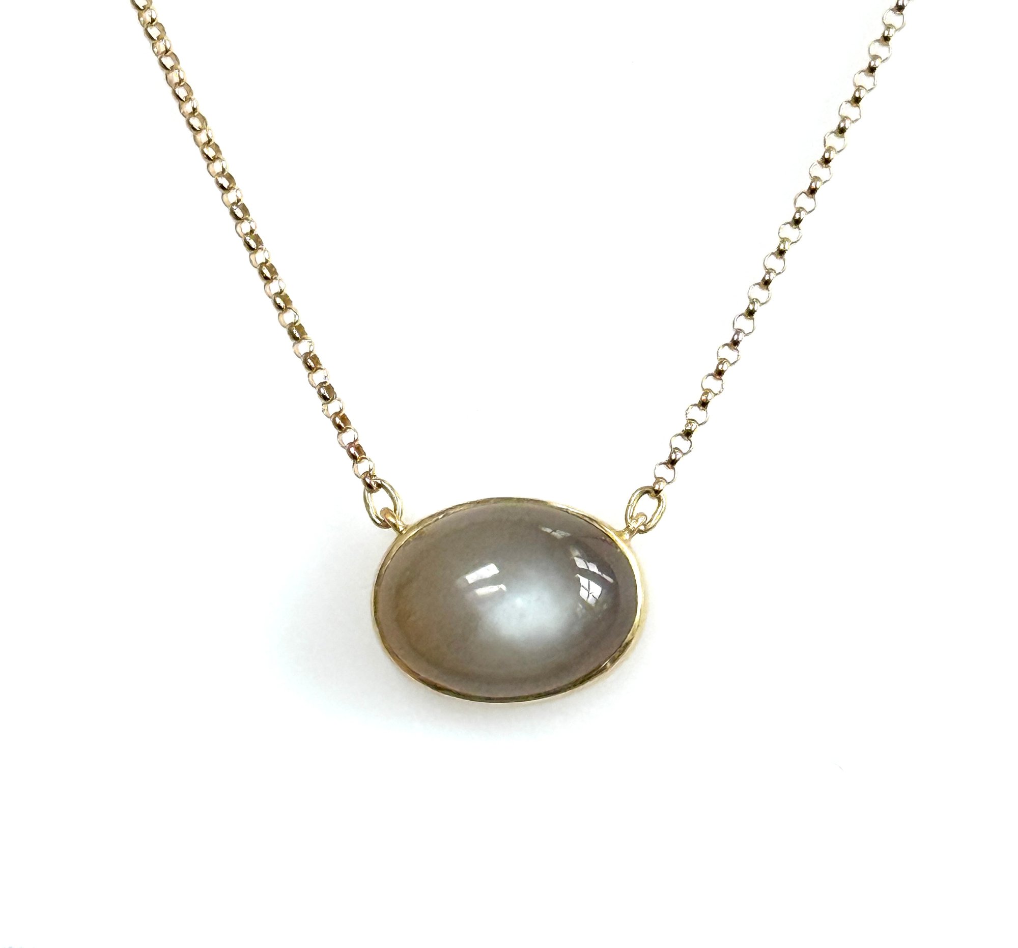 The gray moonstone, prized for its soft adularescence and cool, silvery depth, is individually selected and set within a hand-fabricated bezel — a time-honored goldsmithing technique that gently secures the stone while allowing its natural glow to radiate from every angle. The necklace is a singular, one-of-a-kind creation.