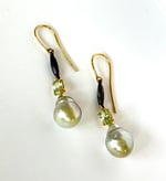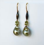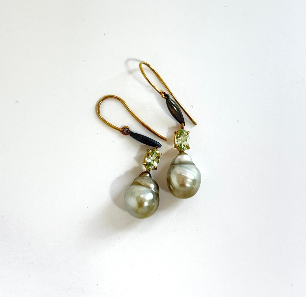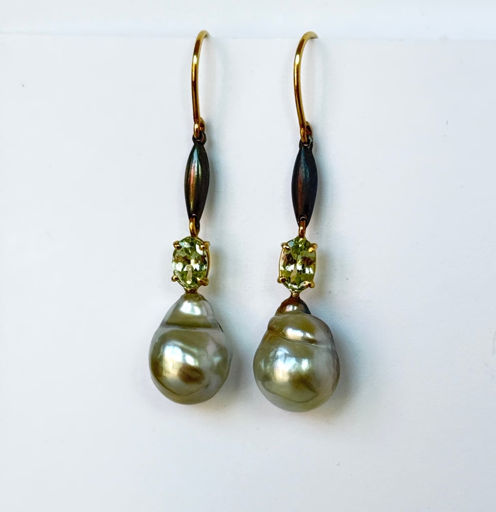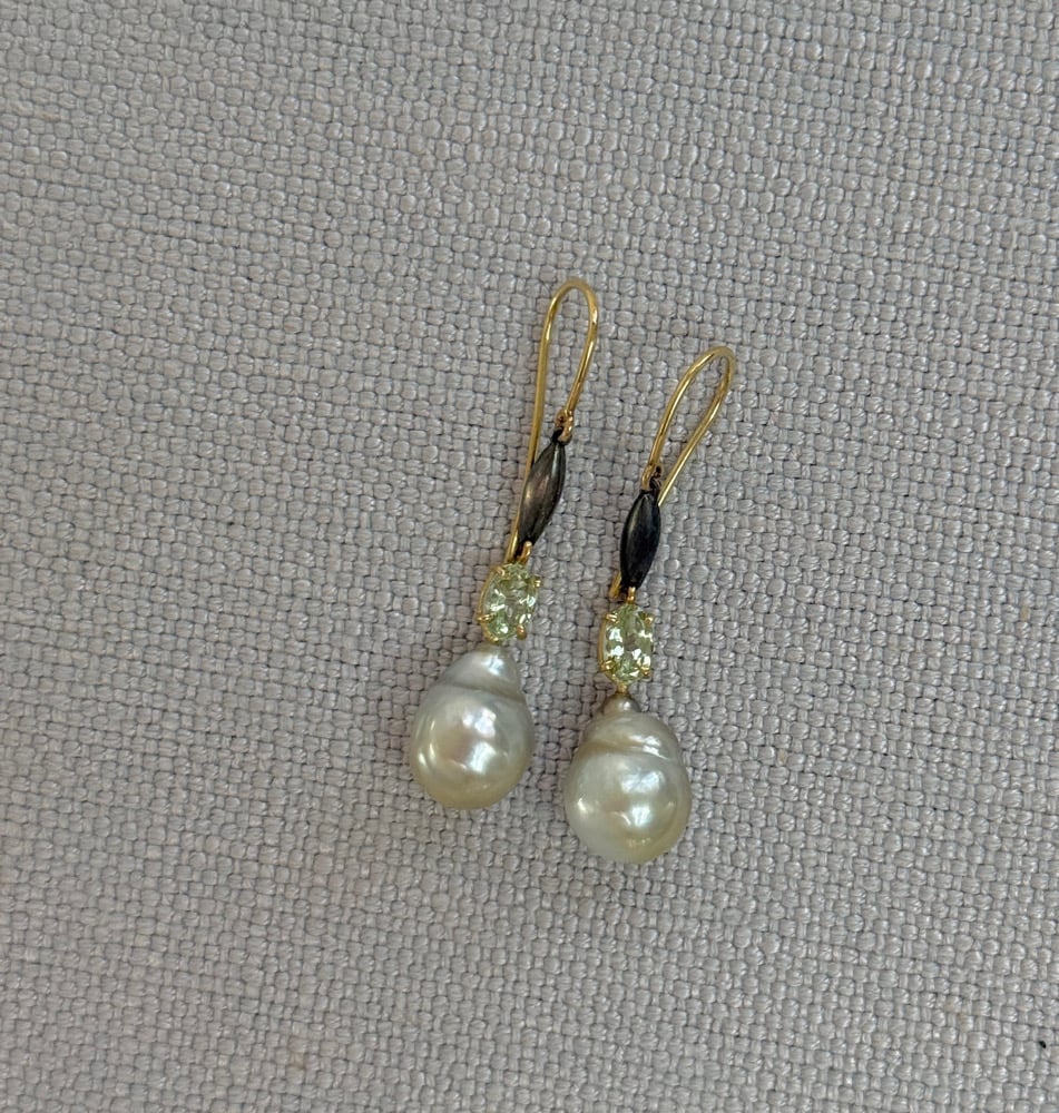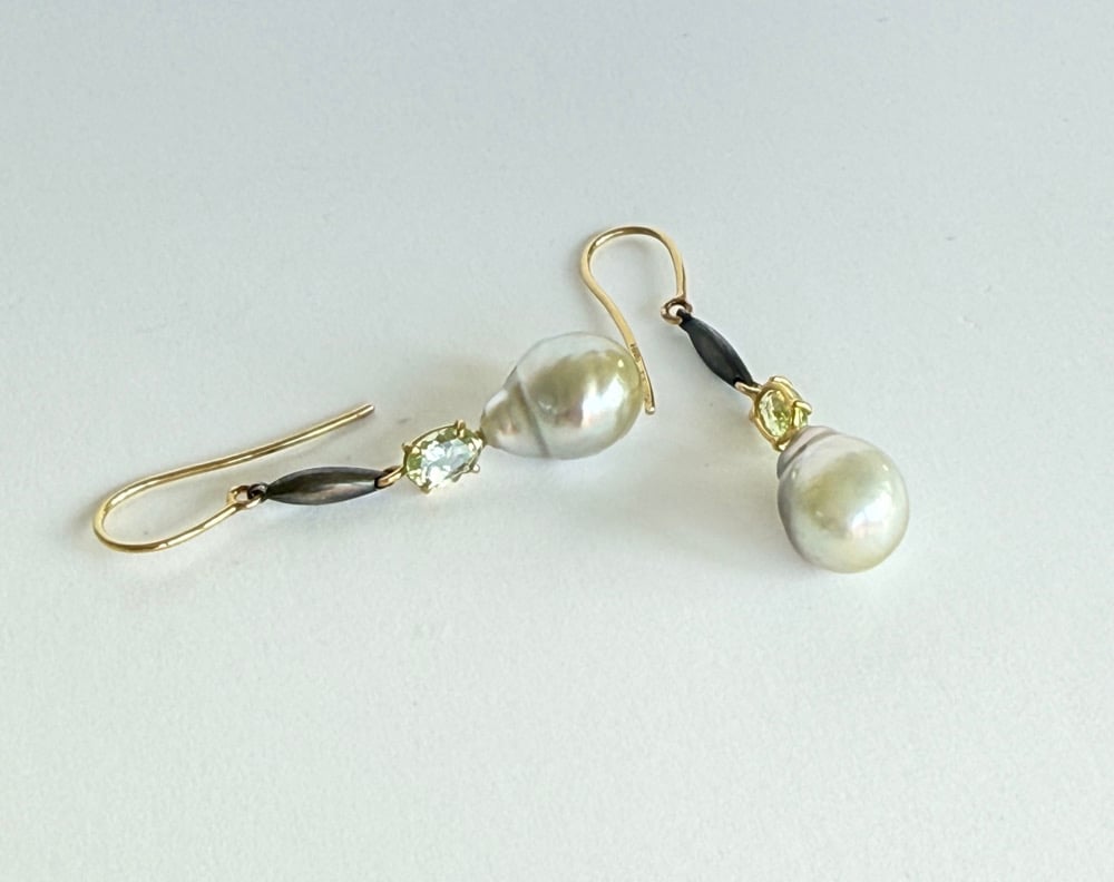 Baroque shape cultured South Sea pearls of natural color off white with green overtones are paired with minty green Mali garnets. Suspeneded from 18k gold earwires and an oxidized silver rice shape element. Free to move and light weight. One of a kind.