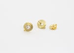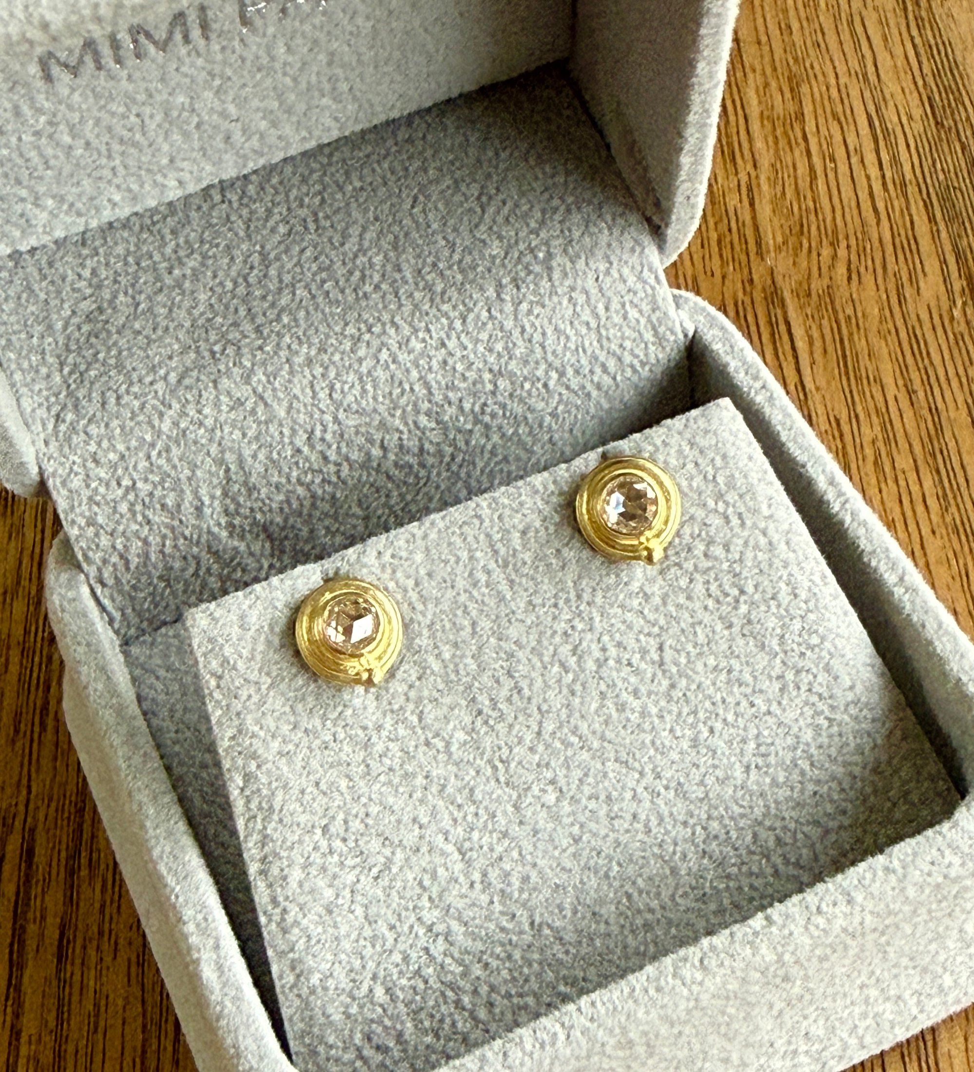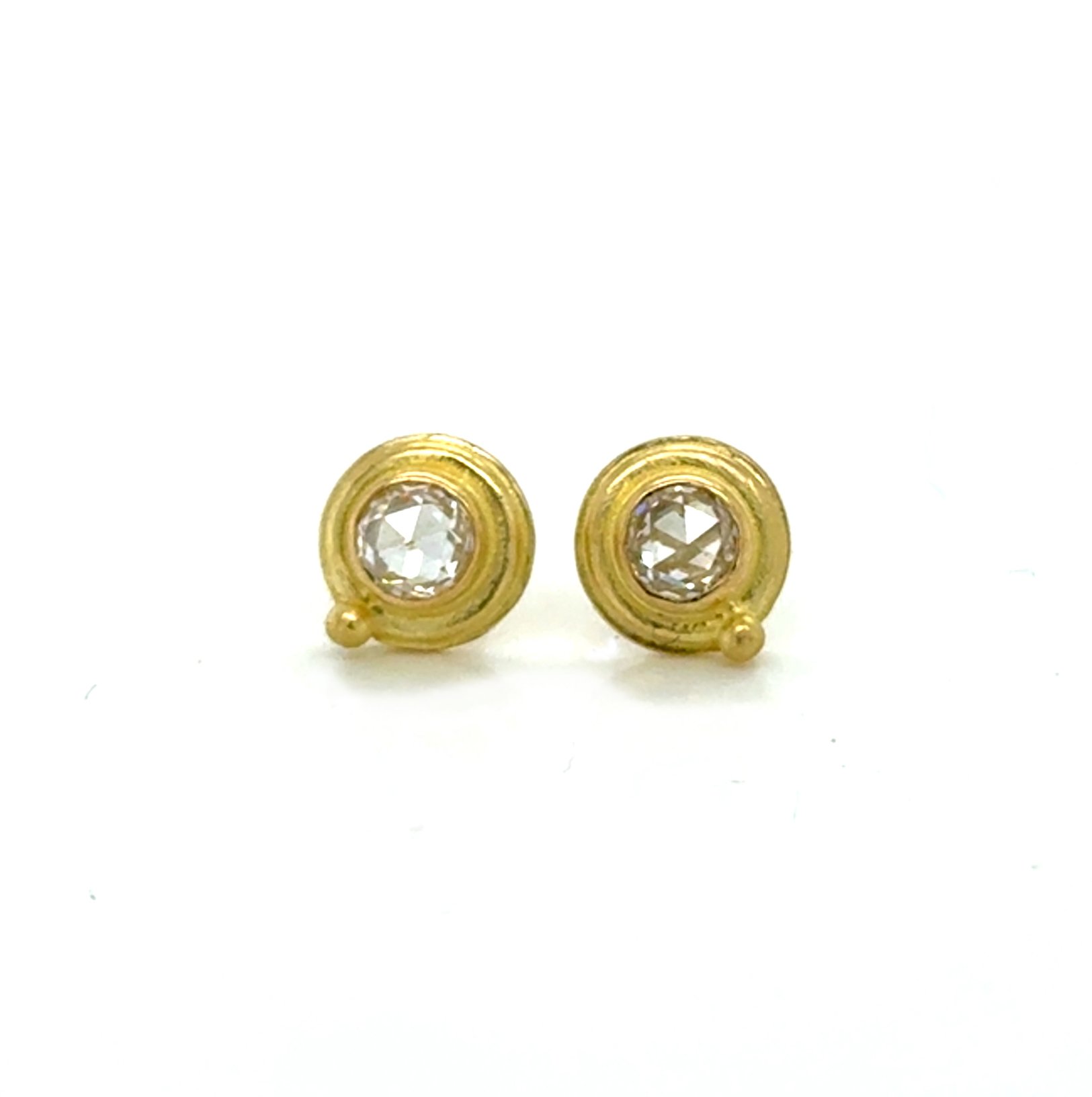 Round wire encircles a bezel set with white rose cut diamonds. A small accent bead balances the design. The earrings have a distinctive old world style. Cast in 18ky. Strong 18k post and nut.